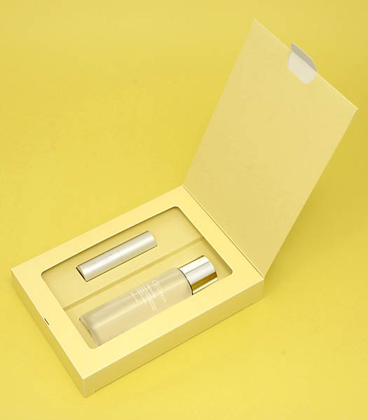 写真の商品は、ガラス瓶の容器に入ったローションとリップのセットです。ガラス瓶を守り、窓ごしに見せる内箱構造と、外形状はスマートな印象を与えてくれるフタ一体型です。(※実際の製品は公開できないため、ダミーを使用したイメージ写真です)